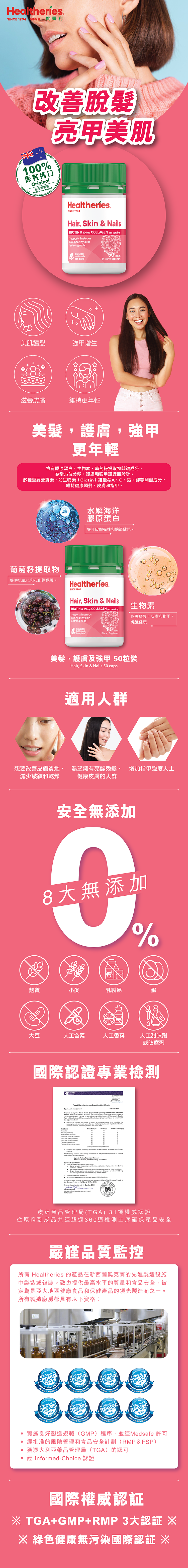 • Taking Healtheries® Hair Skin & Nails each day can help to maintain lustrous hair, vibrant skin and strong nails. With NZ Marine collagen, antioxidant-rich Grape seed extract and other nutrients including Biotin, Zinc, Vitamin A and Vitamin C – it is an easy daily health routine. This formula provides natural skincare from the inside. Just one tablet daily can help you maintain strong, healthy hair, skin and nails.