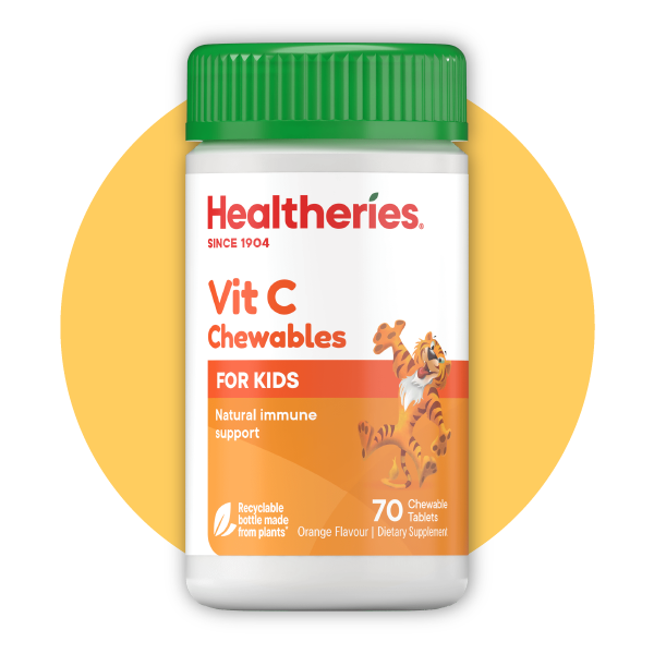 - Healtheries® KidsCare® 兒童咀嚼營養片維他命C為您的孩子提供100毫克純維他命C -「增強免疫力的維他命」。採用一種特殊、弱酸性的維他命C形式,對敏感的胃部較為溫和,並以適合兒童身體的劑量配製。加上以咁嚼片以有趣的動物形狀和美味的水果味呈現,孩子們必定會喜歡服用。